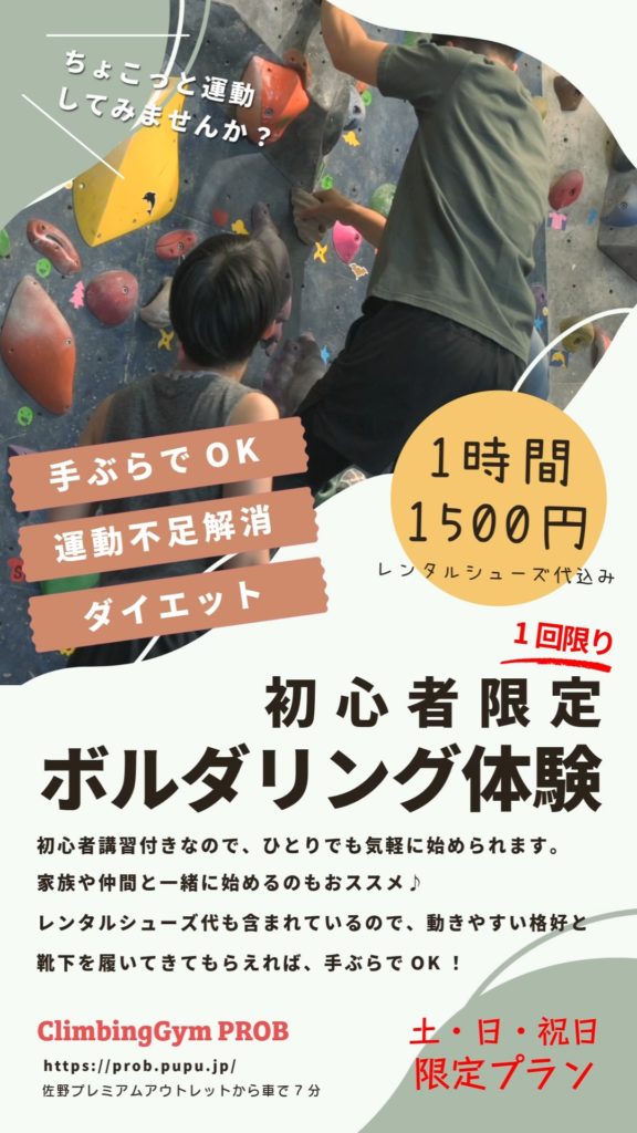 土日祝限定のボルダリング未経験者を対象としたお得な体験パックです。